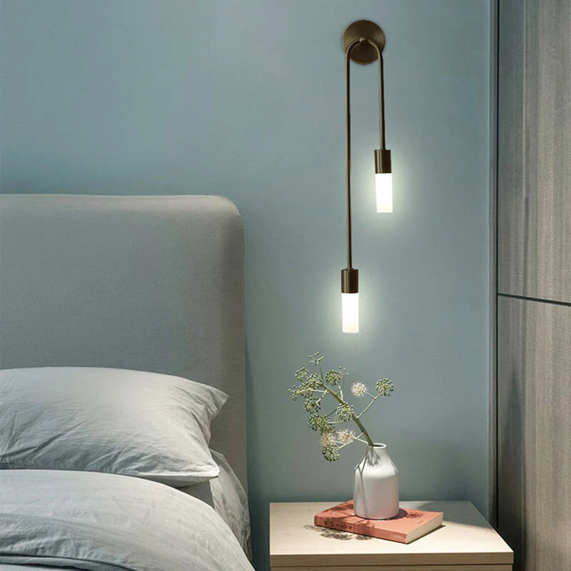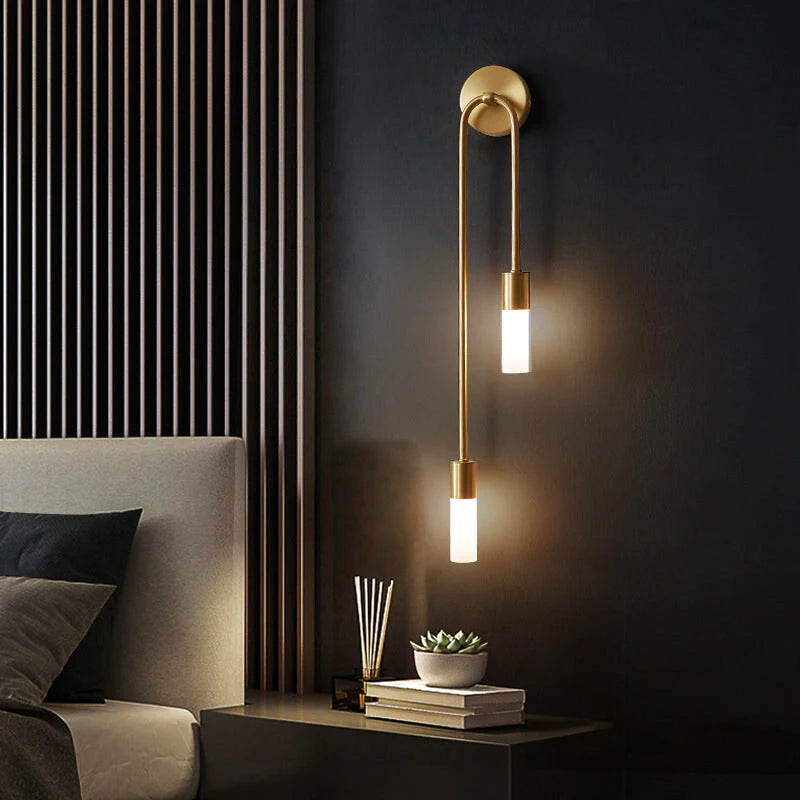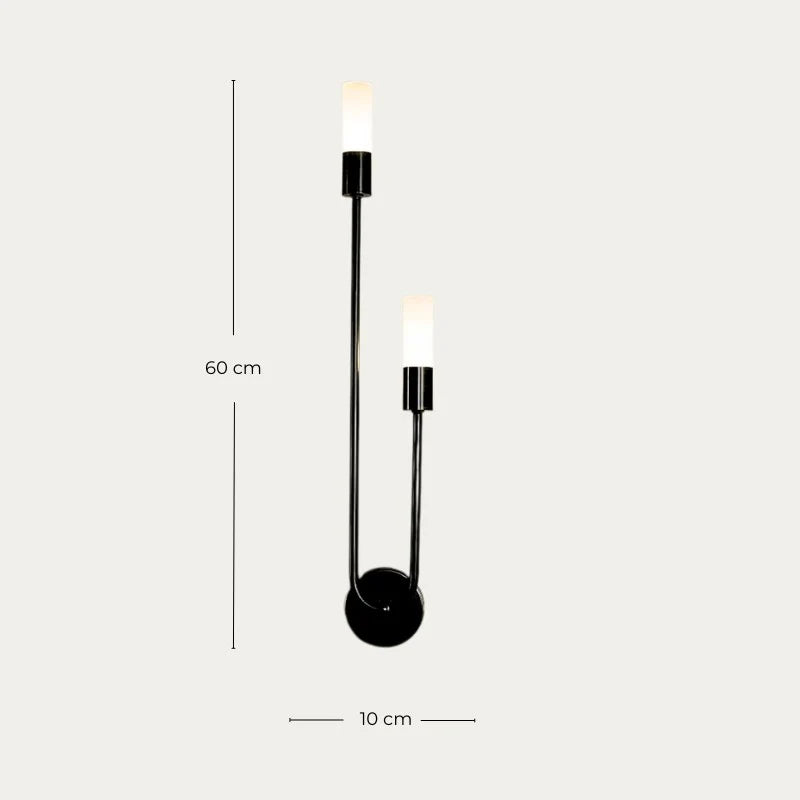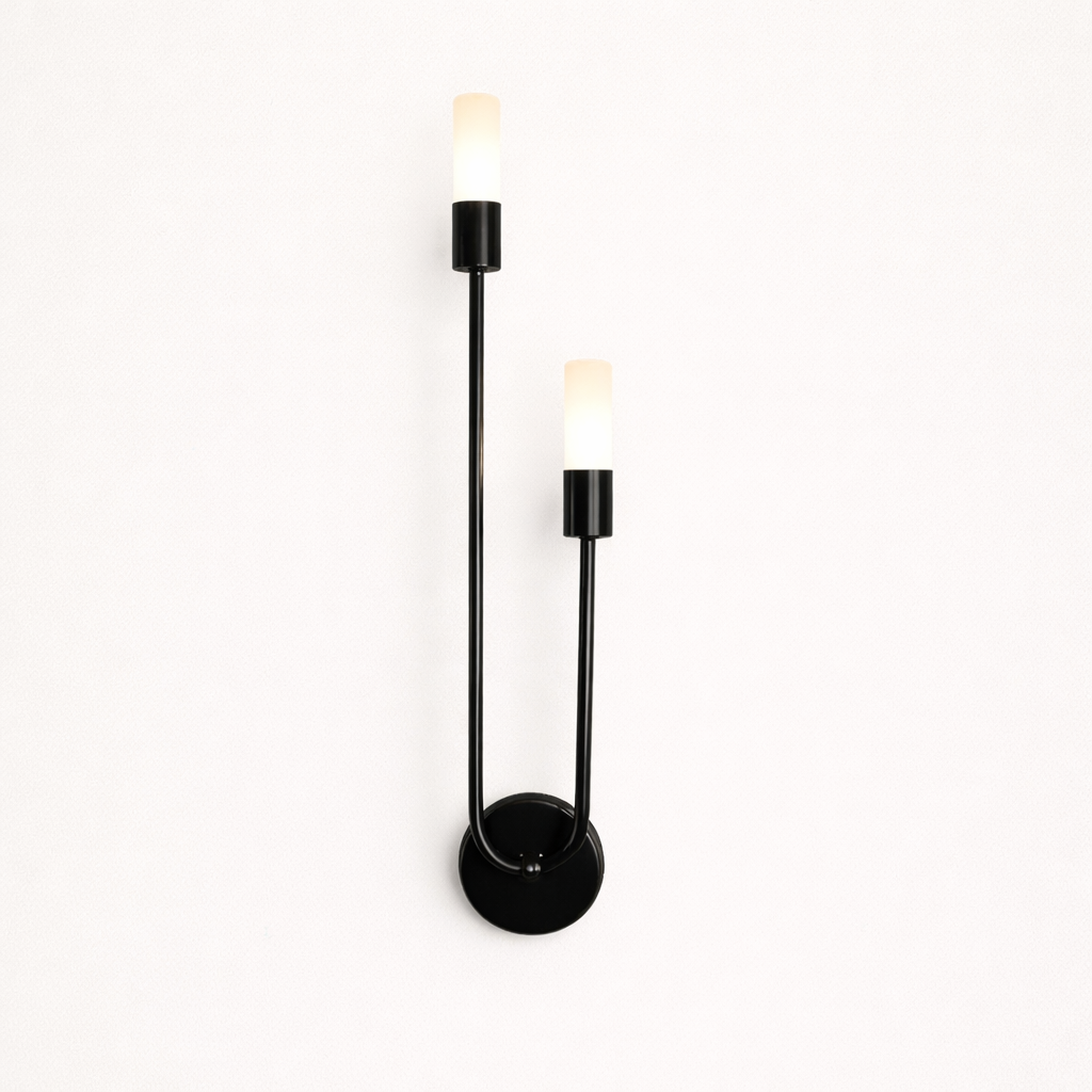 Sa silhouette verticale, composée de deux lignes lumineuses asymétriques, crée un jeu d’équilibre subtil sur le mur. La lumière se diffuse avec douceur, apportant une ambiance chaleureuse et maîtrisée, idéale pour une chambre, un couloir ou un espace de lecture.
