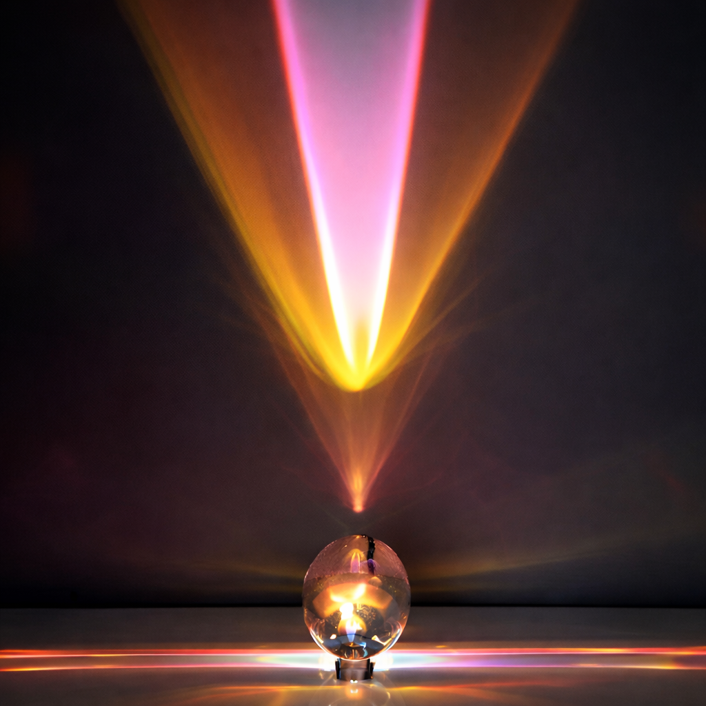 Inspirée par la diffraction naturelle de la lumière, elle transforme un simple faisceau en un dégradé coloré fluide, presque vivant. Une présence lumineuse qui évoque un prisme, un halo, une trace laissée dans l’espace.