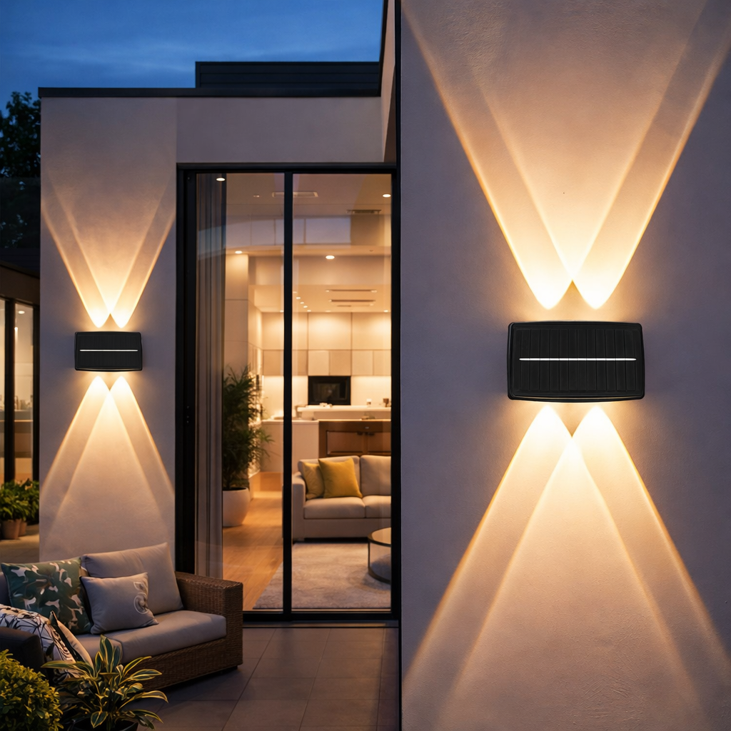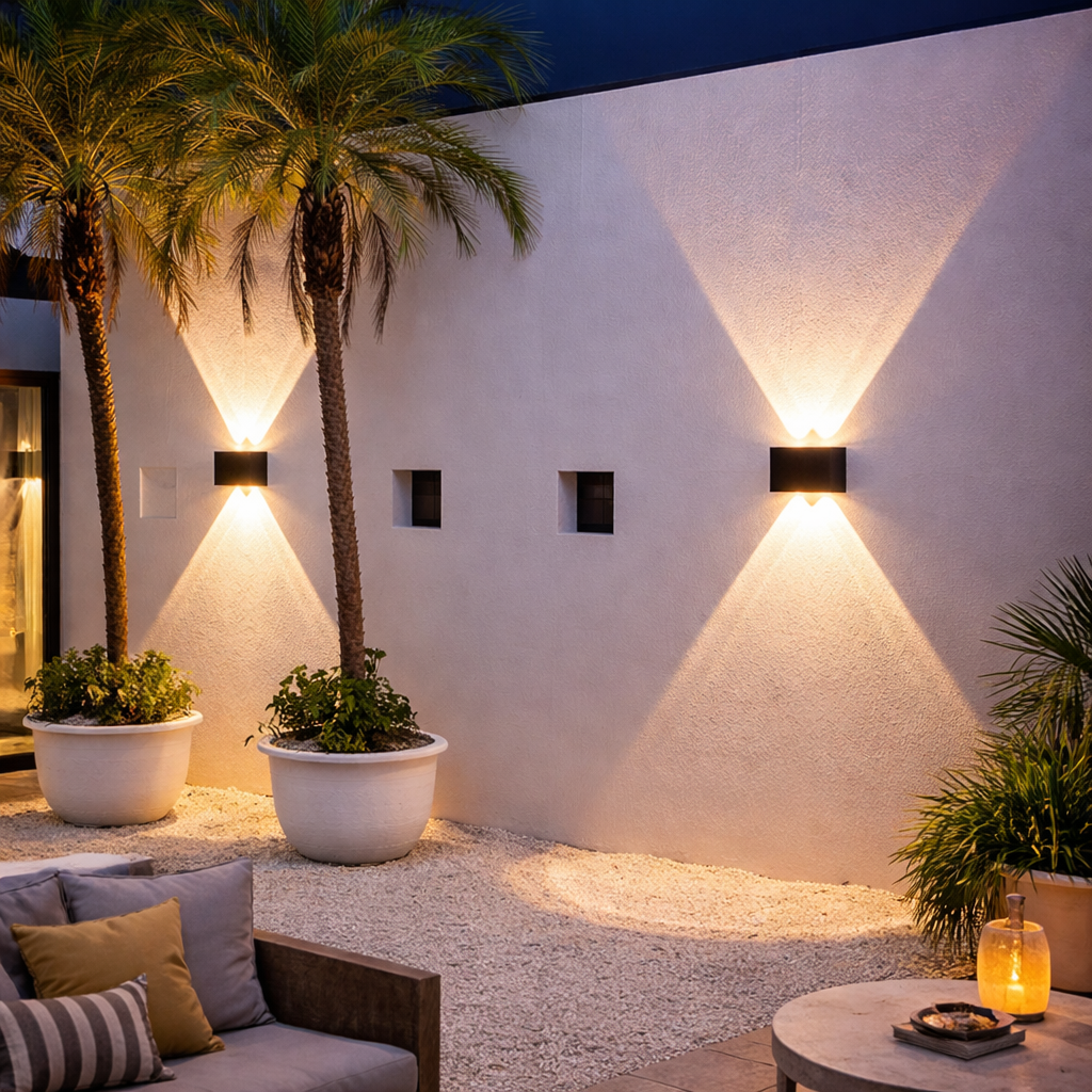 Ses doubles faisceaux symétriques créent un jeu d’ombres et de lumière qui structure l’architecture, valorise une entrée, un mur de terrasse ou une façade contemporaine. Une mise en scène discrète, mais immédiatement remarquable.