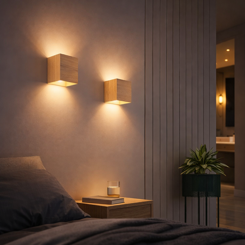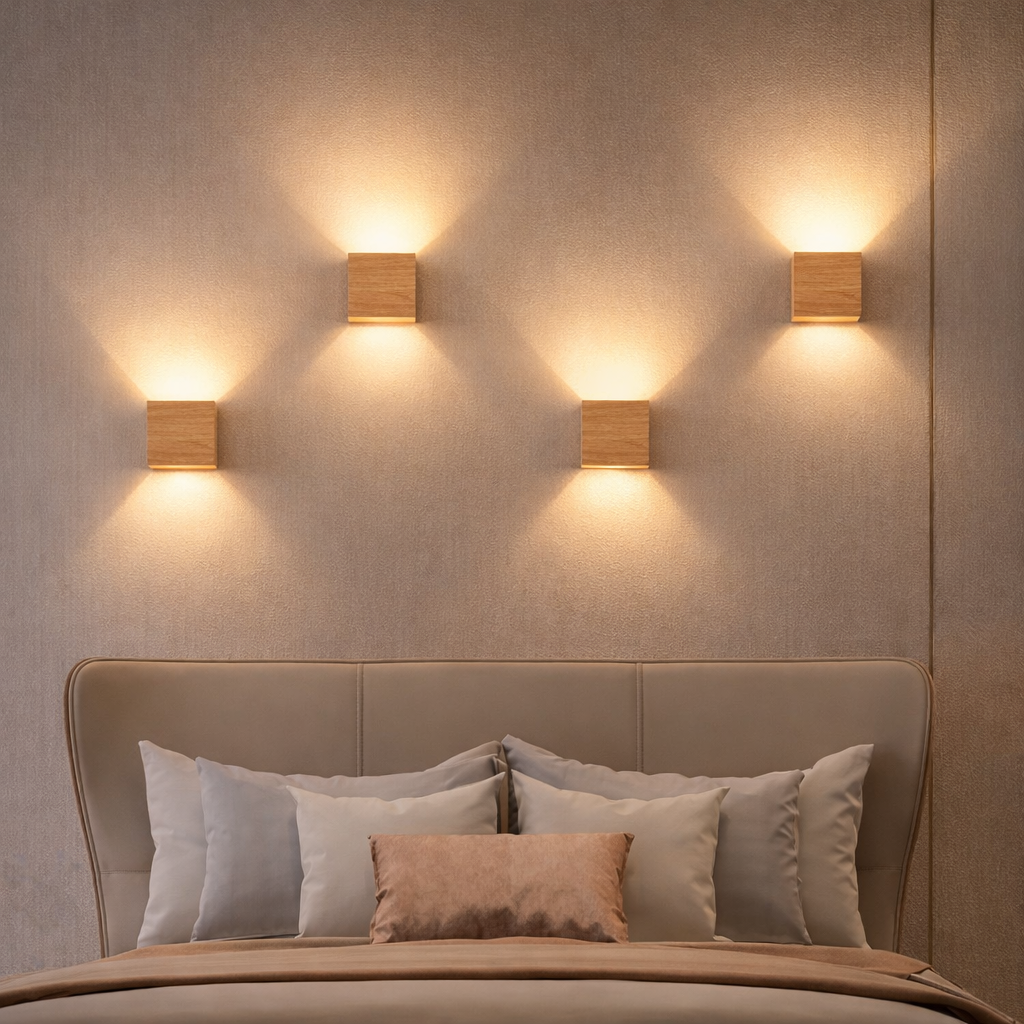 Les faisceaux se déploient vers le haut et vers le bas, dessinant sur le mur un jeu d’ombres subtil qui met en valeur les volumes, les textures et les matières. Une lumière enveloppante, idéale pour une entrée, une terrasse ou un cheminement extérieur.